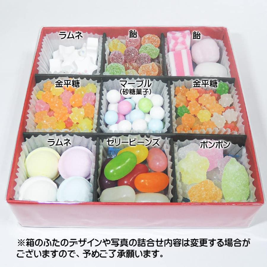 京都らしい雅やかな和柄の箱に入ったお菓子の詰め合わせです。こんぺいとうや京飴、ゼリービーンズなど、彩り豊かな9種類の可愛いお菓子が入っています。